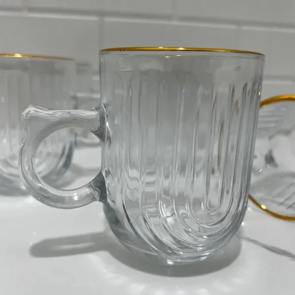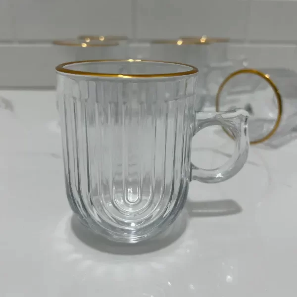 Descubrí la elegancia en cada sorbo con nuestra Taza de Vidrio con Borde Dorado 260ml. Su diseño labrado y el detalle en oro la convierten en la tendencia absoluta de esta temporada.